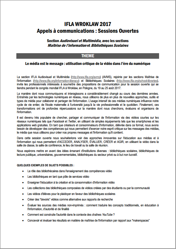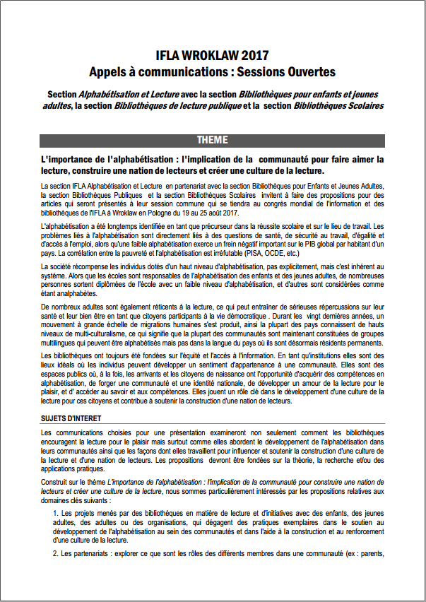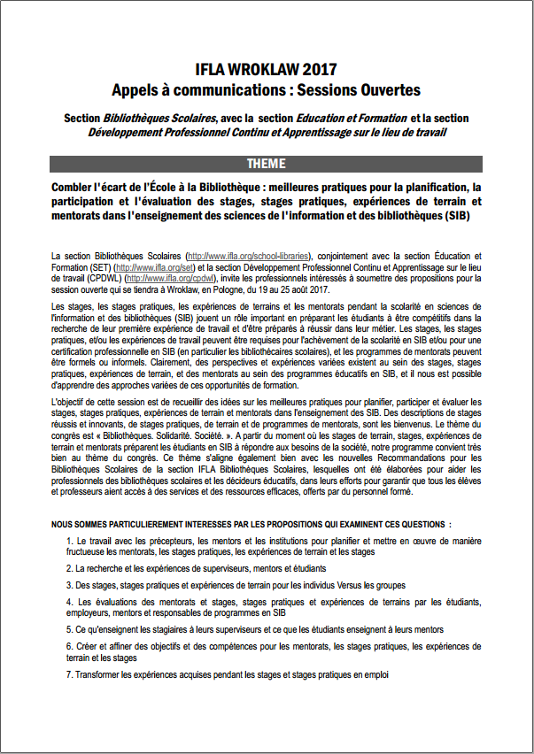Dans le cadre de la préparation de l’IFLA WLIC 2017, qui se déroulera à Wroklaw, en Pologne, au mois d’aout prochain, l’A.P.D.E.N. a le plaisir de placer ici à votre disposition trois appels à communications pour les sessions ouvertes, traduits de l’anglais par Valérie Glass, en charge du dossier "International" au sein du bureau national.