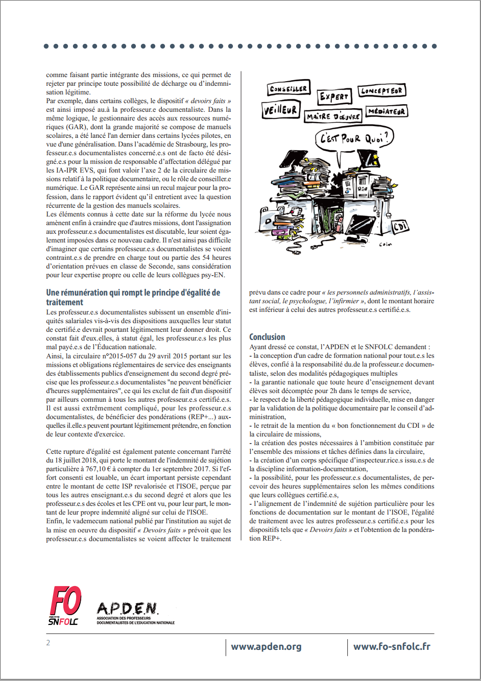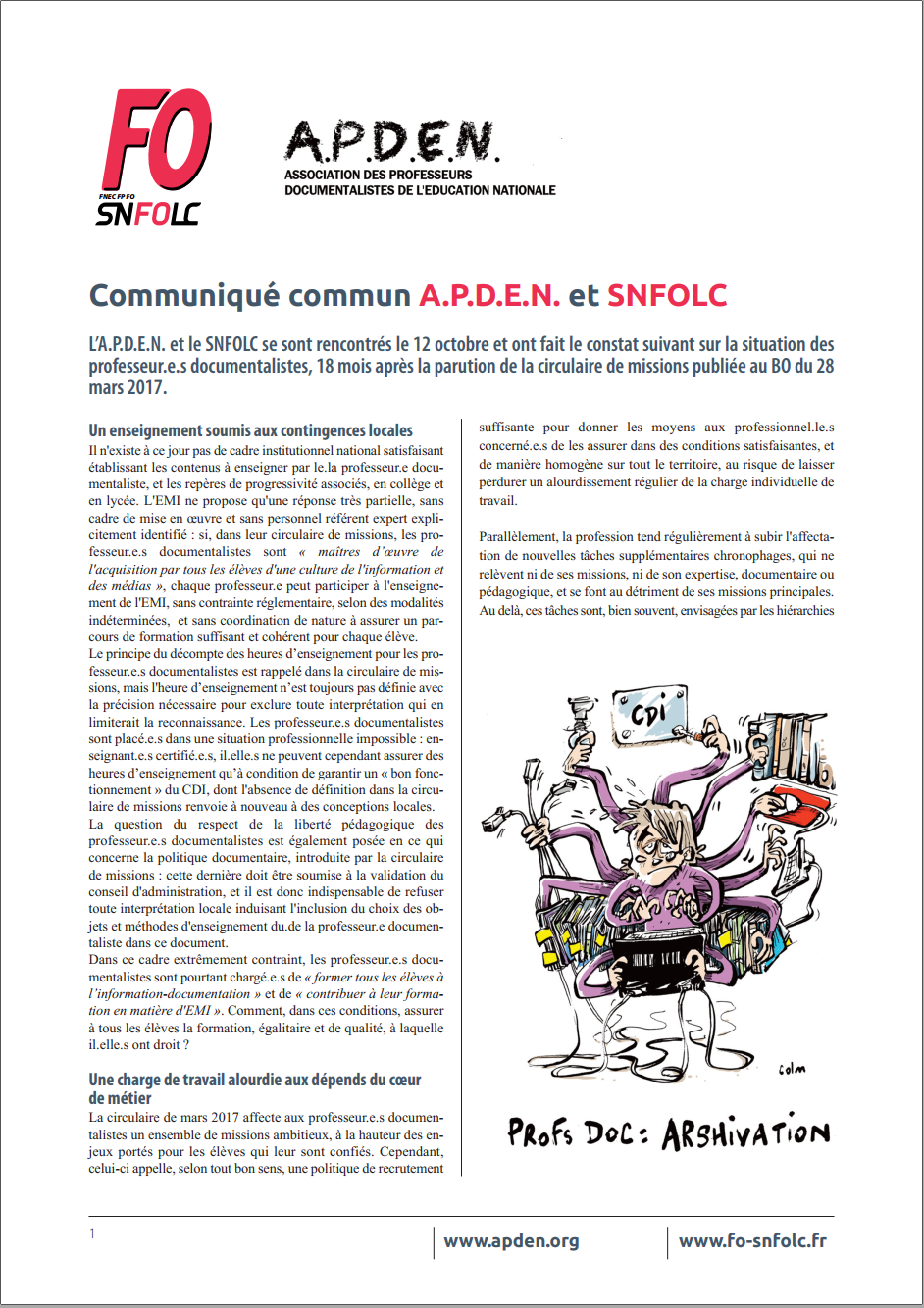 L’A.P.D.E.N. et le SNFOLC se sont rencontrés le 12 octobre 2018 et ont fait le constat suivant sur la situation des professeur.e.s documentalistes, 18 mois après la parution de la circulaire de missions publiée au BO du 28 mars 2017.