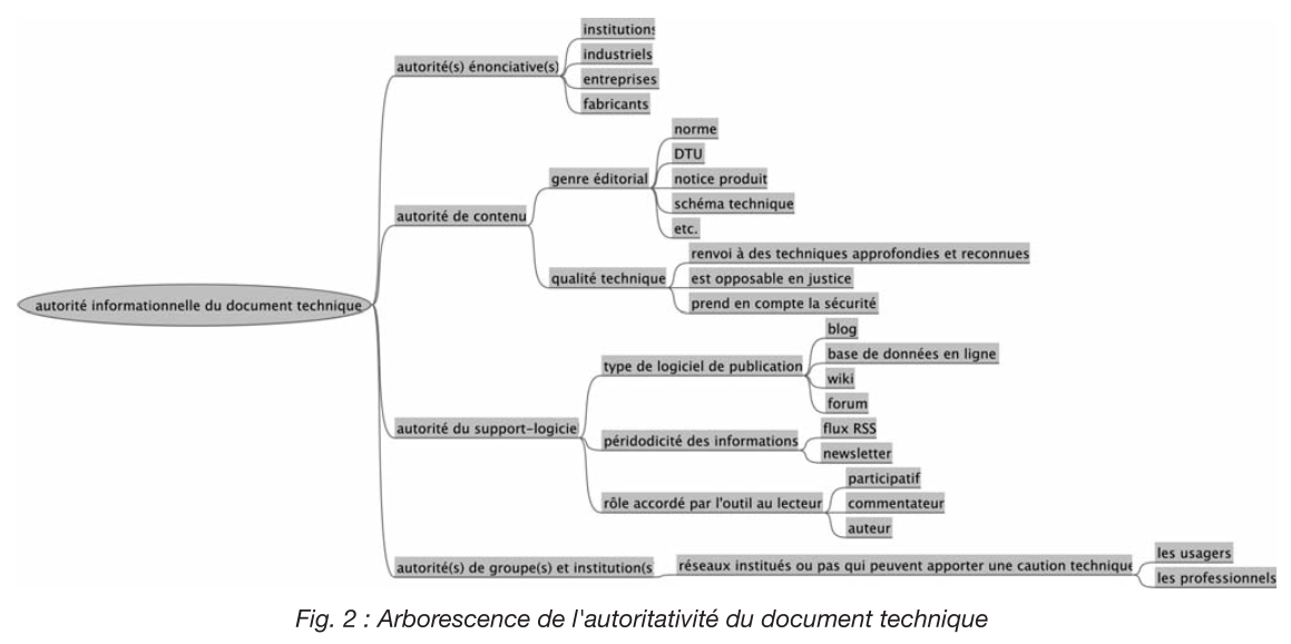 On peut représenter cette autoritativité [12] du document technique, sous la forme d’une arborescence dont chaque branche principale figure un signe d’autorité à analyser. Les branches secondaires étant les indices à repérer pour chacun dans le document technique. Une conséquence directe de cette théorie est que la validation de l’information se fait désormais dans le contexte du régime auctorial de l’autorité informationnelle ou de l’autoritativité, notions imbriquées à enseigner au préalable de celle de veille technologique.