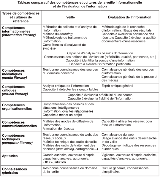 Un tableau valant mieux qu’un long discours, on trouvera ci-après le récapitulatif des compétences mobilisées dans la veille et l’évaluation de l’information.