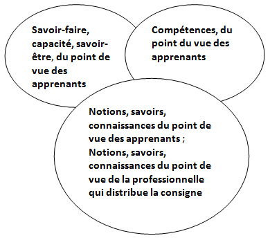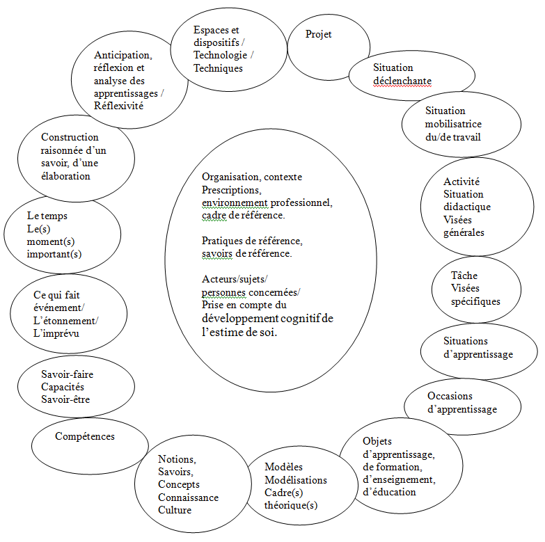 Parmi les éléments en interaction nous tenons compte aussi de la notion d’événement et de celle « d’apprenant prescripteur » (travaillée au sein d’IDEKI) qui nous ramènent vers la compétence nécessaire d’adaptation à une situation qui n’était pas forcément anticipée. La compétence professionnelle consiste ainsi à la fois à anticiper, à gérer l’instant présent, l’imprévu et à analyser, en métacognition, le réel de l’activité.