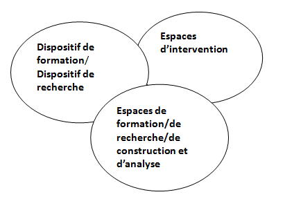 Le dispositif de formation repose sur l’élaboration par les futurs professeurs des écoles d’une situation d’apprentissage. Le dispositif de recherche se bâtit avec l’équipe de formateurs-documentalistes concernée. Il y a deux espaces d’intervention dans lesquels agissent les professionnels : IUFM/ESPE – CRD (Centre de Ressources Documentaires). Et trois espaces dans lesquels se construisent la formation, la recherche, l’analyse : IUFM/ESPE – CRD - Laboratoire de recherche.