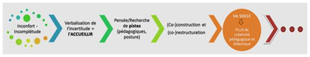 Notre schéma fait état d’une étape « finale » désignée par le terme socle. Que l’on ne se méprenne surtout pas : en aucun cas, nous ne pensons avoir résolu nos sentiments d’inconfort pédagogique et/ou didactique. Il nous semble que cela n’est tout simplement pas possible, si tant est d’ailleurs que cela soit souhaitable. Mais pour un élément d’inconfort identifié, nous avons cherché chacune, à partir de nos ressources et de nos environnements - sociaux, informationnels… - à exploiter l’incertitude comme levier. C’est pourquoi notre schéma ne se « termine » pas : sans cesse, l’enseignant re-questionne, ré-interroge - sa posture, ses pratiques, ses contenus didactiques -, de sorte que le processus dont nous faisons part est sans aucun doute amené à être ré-entrepris par le même professionnel plusieurs fois au long de son exercice du métier. Reprendre ce processus, en l’appliquant à un autre facteur d’inconfort, pour découvrir et exploiter un autre levier que celui déjà expérimenté, contribuera à n’en pas douter à renforcer davantage le « socle incertitude ».