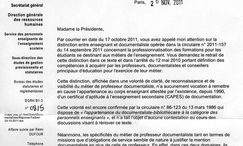 Par un courrier du 17 octobre 2011, la FADBEN protestait auprès du ministère de l’Éducation Nationale de la distinction effectuée dans la rédaction de la circulaire du 14 septembre 2011 entre les enseignants et les documentalistes.