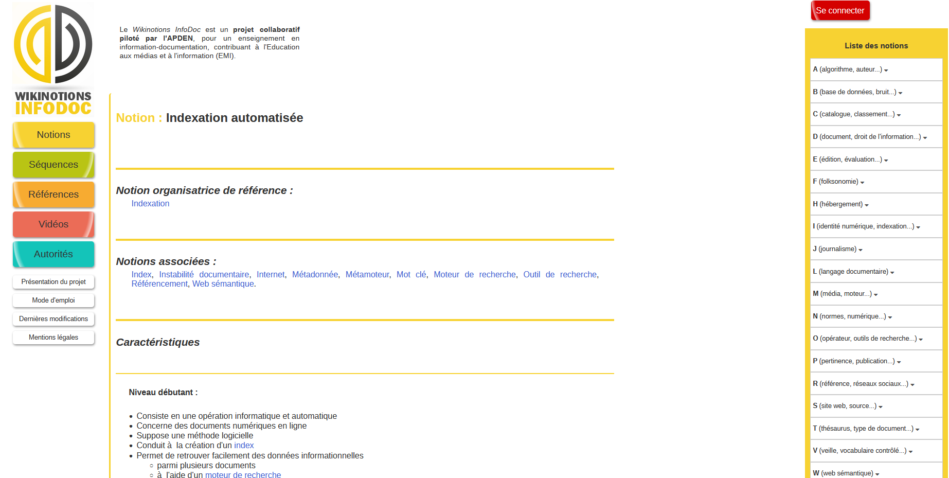 Créé en 2010 et revu en 2013, le Wikinotions Infodoc est devenue une plateforme incontournable pour la profession, mise en œuvre et gérée par l’APDEN. Après l’utilisation d’un logiciel, MédiaWiki, qui ne répondait plus qu’en partie aux besoins du Wikinotions, nous avons choisi de développer notre propre plateforme, qui lie à la fois principes du wiki et fonctionnement d’un catalogue documentaire de références.