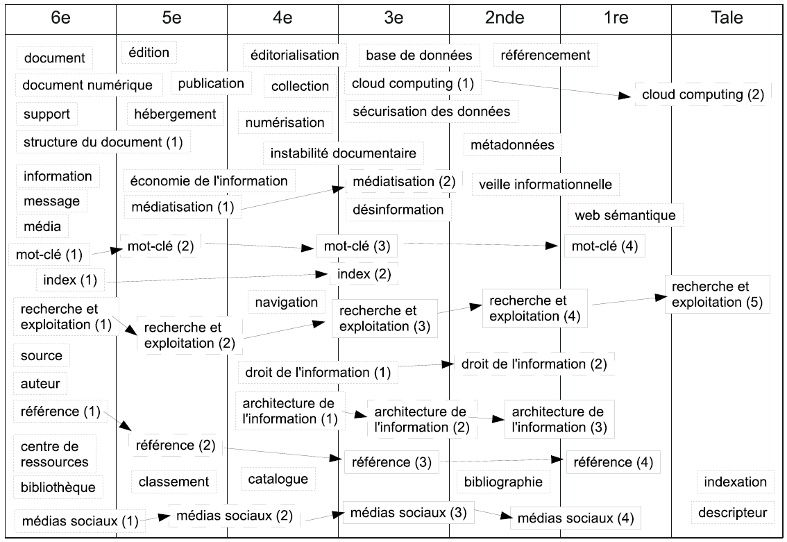 Ces réflexions sur les pratiques pédagogiques des professeurs documentalistes et sur la prise en considération du développement de l’enfant, pour tenir compte de leurs capacités d’assimilation, conduisent à esquisser une distribution cohérente des notions spécifiques de l’information-documentation, de la Sixième à la Terminale, à partir de la liste disponible aujourd’hui dans le Wikinotions Info-doc [13]. Cette progression, qui suppose des éléments de découverte, d’initiation et d’approfondissement, en réponse aux principes d’une élaboration des programmes telle que définie dans la charte adoptée par le Conseil supérieur des programmes (CSP) et publiée le 3 avril 2014 [14], n’oublie pas, ici encore de manière implicite, le souci d’une progression globale de la maternelle à l’université, telle que souhaitée en 2003 lors des « Assises nationales pour l’éducation à l’information : l’éducation à l’information et à la documentation, clef pour la réussite de la maternelle à l’université ».