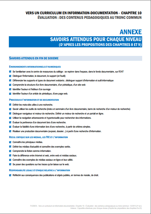 Par ailleurs, l’enseignant documentaliste peut disposer d’outils d’évaluation, qui lui permettent de cerner, pour lui, les acquis progressifs des élèves en termes de capacités, en lien avec les objectifs formalisés auprès des élèves afin qu’ils perçoivent leur progression, leurs forces et leurs faiblesses, selon les modalités définies par l’enseignant.