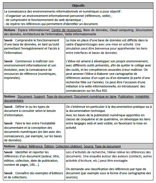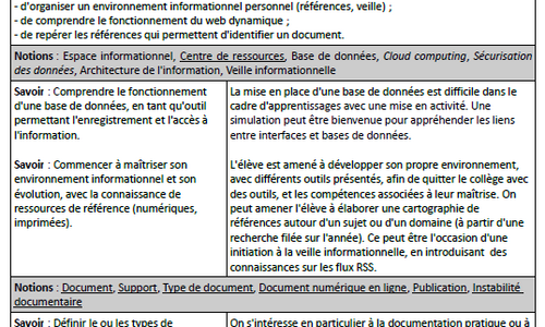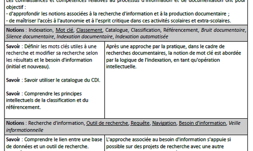 - d’approfondir les notions associées à la recherche d’information et à la production documentaire ; - de favoriser progressivement l’accès à l’autonomie et à l’esprit critique dans ces activités scolaires et extra-scolaires. | |