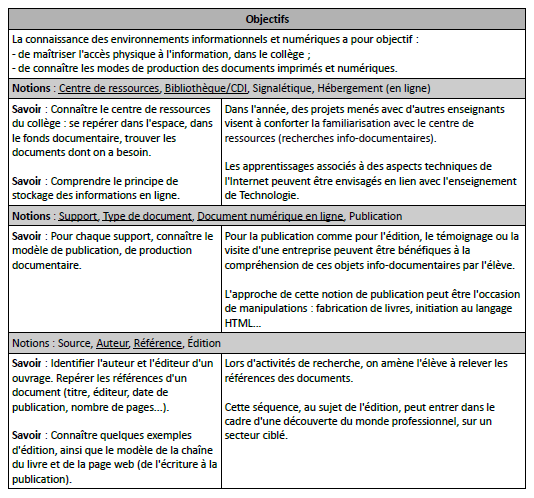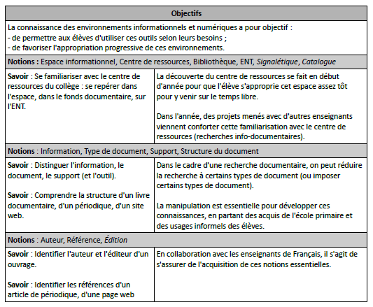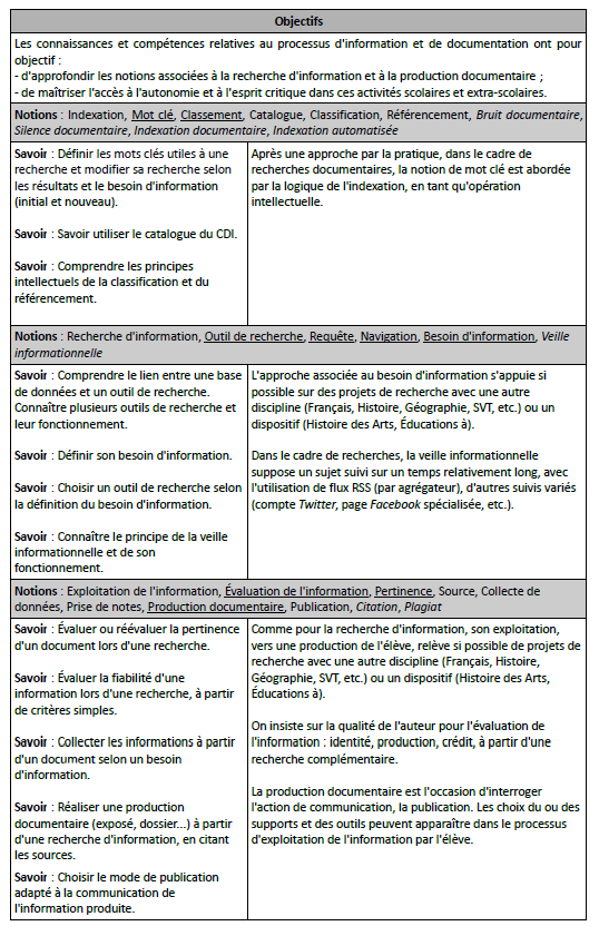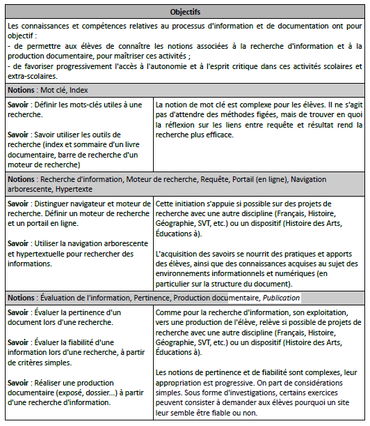 - de permettre aux élèves de connaître les notions associées à la recherche d’information et à la production documentaire, pour maîtriser ces activités ; - de favoriser progressivement l’accès à l’autonomie et à l’esprit critique dans ces activités scolaires et extra-scolaires. | |