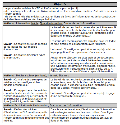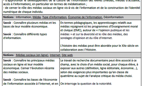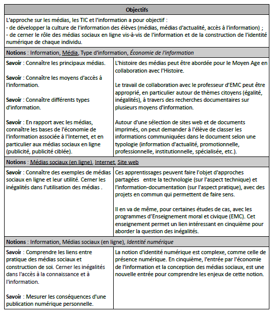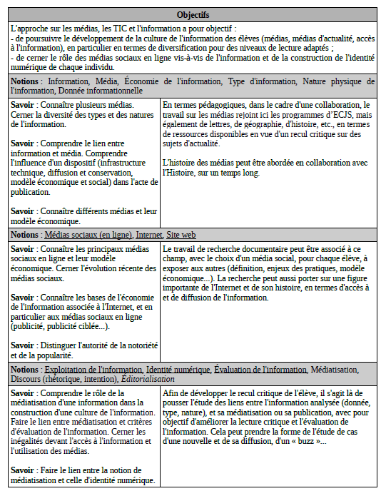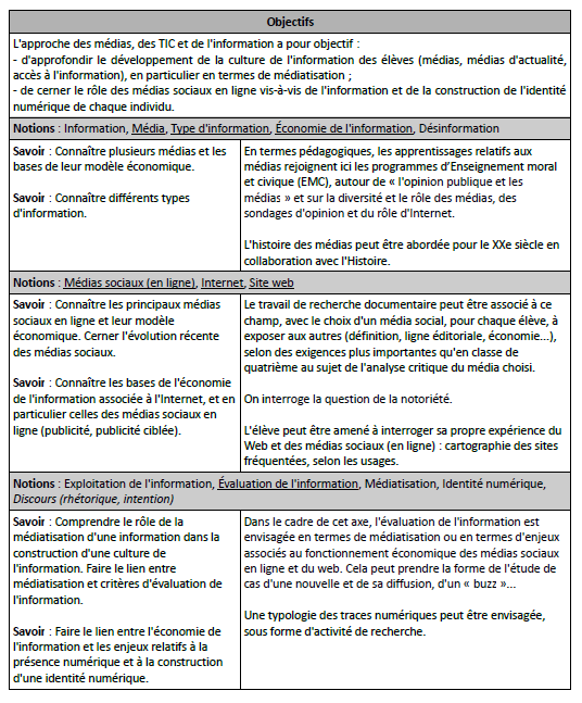 - d’approfondir le développement de la culture de l’information des élèves (médias, médias d’actualité, accès à l’information), en particulier en termes de médiatisation ; - de cerner le rôle des médias sociaux en ligne vis-à-vis de l’information et de la construction de l’identité numérique de chaque individu. | |