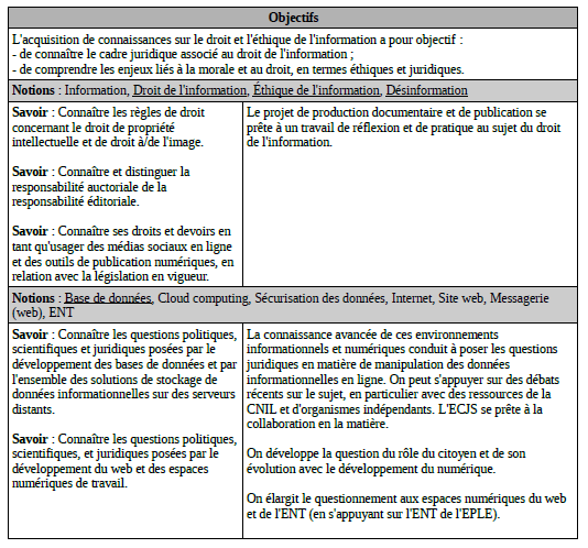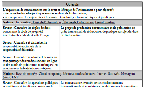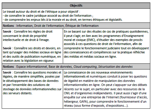 En classe de quatrième, en lien avec les programmes de l’Enseignement moral et civique (EMC) relatifs à la découverte du droit et du fonctionnement de la justice en France, les élèves acquièrent des connaissances plus précises sur le droit de l’information : droit de propriété intellectuelle, droit à l’image, avec une découverte de l’éthique de l’information, en termes de médias d’actualité, mais aussi en termes de pratiques personnelles et professionnelles.