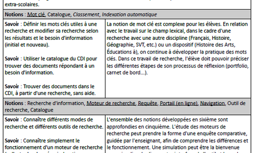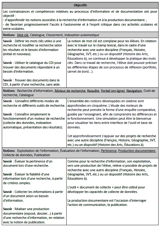 En cinquième, les apprentissages de sixième sont approfondis, au sujet des notions déjà développées, avec le souci de préciser, au fur et à mesure du collège, les notions de pertinence et d’évaluation de l’information.