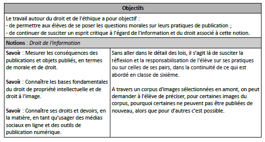 | Savoir : Réfléchir aux conséquences des publications et objets publiés, en termes de morale, de droit. | Sans aller dans le détail des lois, il s’agit là de susciter la réflexion et la responsabilisation de l’élève sur ses pratiques ou sur celles de ses pairs. |