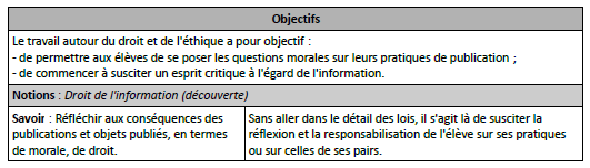 - de permettre aux élèves de se poser les questions morales sur leurs pratiques de publication ; - de commencer à susciter un esprit critique à l’égard de l’information. | |